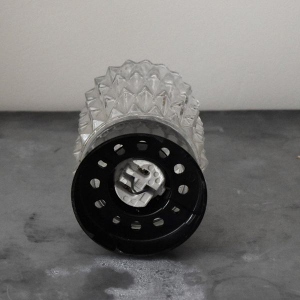 Jaren 60 Plafonniere, Bakelieten houder/fittingPlafondlamp met geperst glazen bol, diamantvorm